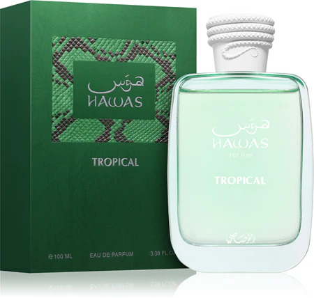 Hawas Tropical de Rasasi es una fragancia de la familia olfativa Aromática Verde para Hombres. Esta fragrancia es nueva. Hawas Tropical se lanzó en 2025. Las Notas de Salida son Agua de coco, hojas de higuera y jengibre; las Notas de Corazón son coco, higo y menta; las Notas de Fondo son sándalo, haba tonka y almizcle.