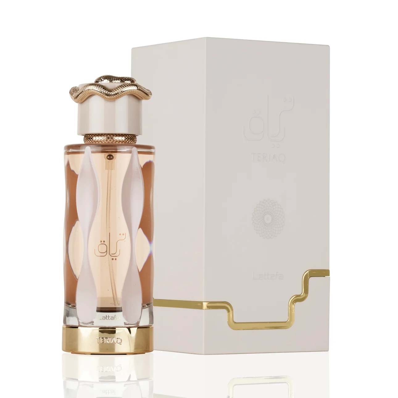 Teriaq de Lattafa Perfumes es una fragancia de la familia olfativa para Mujeres. Esta fragrancia es nueva. Teriaq se lanzó en 2024. La Nariz detrás de esta fragrancia es Quentin Bisch. Las Notas de Salida son caramelo, almendra amarga, chabacano y pimienta rosa; las Notas de Corazón son miel, ruibarbo, flores blancas y rosa; las Notas de Fondo son cuero, vainilla, almizcle, vetiver y ládano.